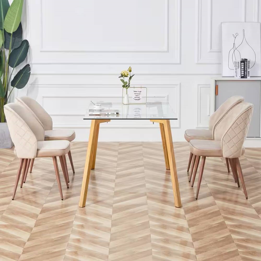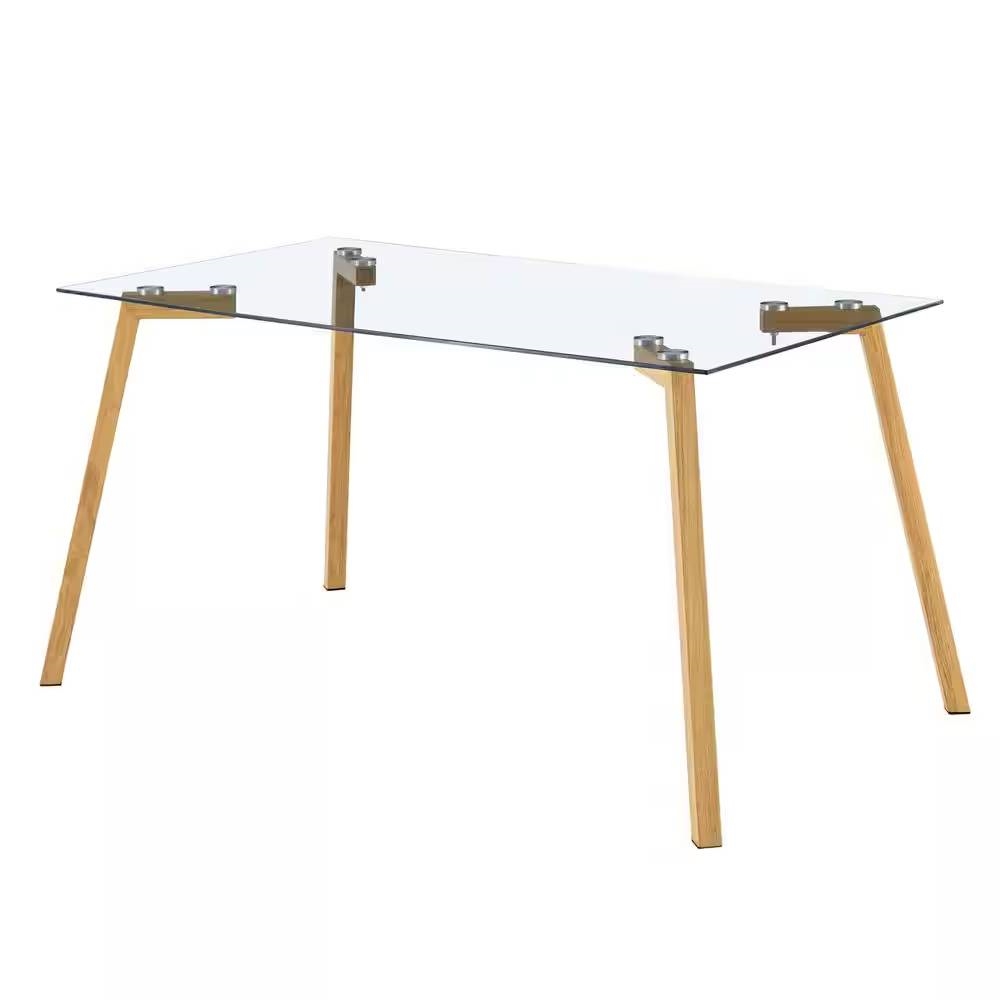 Elevate your dining area with our Modern 47-inch x 29-inch Glass Top Dining Table with Wood-Look Metal Legs that comfortably seats 4-6. Crafted with a 0.31 in. thick tempered glass tabletop and sturdy powder coating metal legs, it offers stability and durability. Its minimalist design, featuring strong metal legs with adjustable feet, ensures reliability while providing a versatile space for gatherings and adding a touch of contemporary elegance to any room.