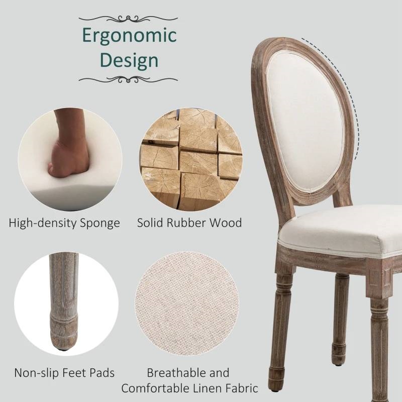 These Chic French Style Set of 2 Vintage Upholstered Armless Curved Back Dining Chairs has an elegant and rustic style, gracefully curved back, classic color scheme, and beautifully carved leg patterns. These armless chairs have a rubberwood frame and legs, and linen fabric upholstery with a high-density sponge makes these modern dining chairs breathable and provides high comfort. The padded backrest supports your back and lumbar, while the armless design allows for multiple sitting options and freedom of movement while seated. These dining set chairs work great in your dining room, kitchen, or living room. The footpads on each leg ensure you won't scuff up your hardwood or tile floors and stay in place on the carpet.
