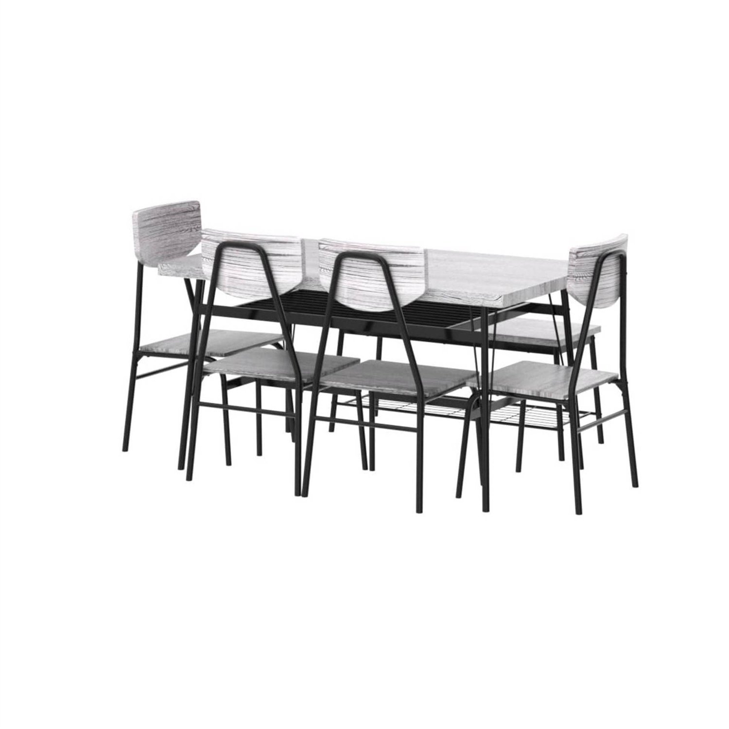 This Modern 6-Piece Dining Set with Grey Wood Top Table 4 Chairs and Storage Bench includes a table, 4 chairs, and a 2-person bench, perfect for family meals or gatherings in your kitchen or dining area. Metal racks under the tabletop and the bench can conveniently hold books, board games, seat cushions, blankets, table mats, coasters, and much more. The rectangular, vinyl wrapped MDF table top is cut extra thick to make it perfect for eating dinner, working on your laptop, or playing games with friends and family. Smooth table & chair finishes let you easily wipe them clean to take care of messes, so your dining set can maintain a new look through years of use. Crafted with a durable, powder-coated steel frame, this set is built to remain sturdy for long-lasting use.