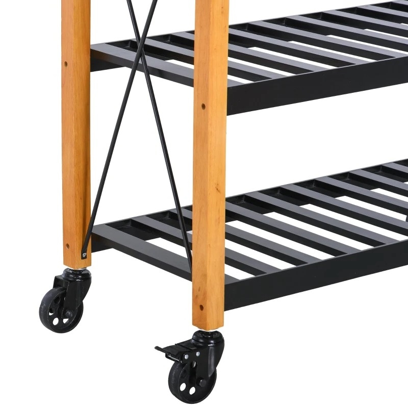 This FarmHouse Rolling Kitchen Island 2 Drawers Storage with Butcher Block Rubberwood Top makes kitchen organization a breeze. The industrial style with the perfect color matching of rubber color and black makes the kitchen island perfectly fit in a luxury villa or farmhouse theme. Equipped with a wide countertop, two drawers and two spacious shelves, all of your tableware, wine, fruits and vegetables and dinners can be fine placed. The side towel rails is convenient to hold napkins or hand towels.