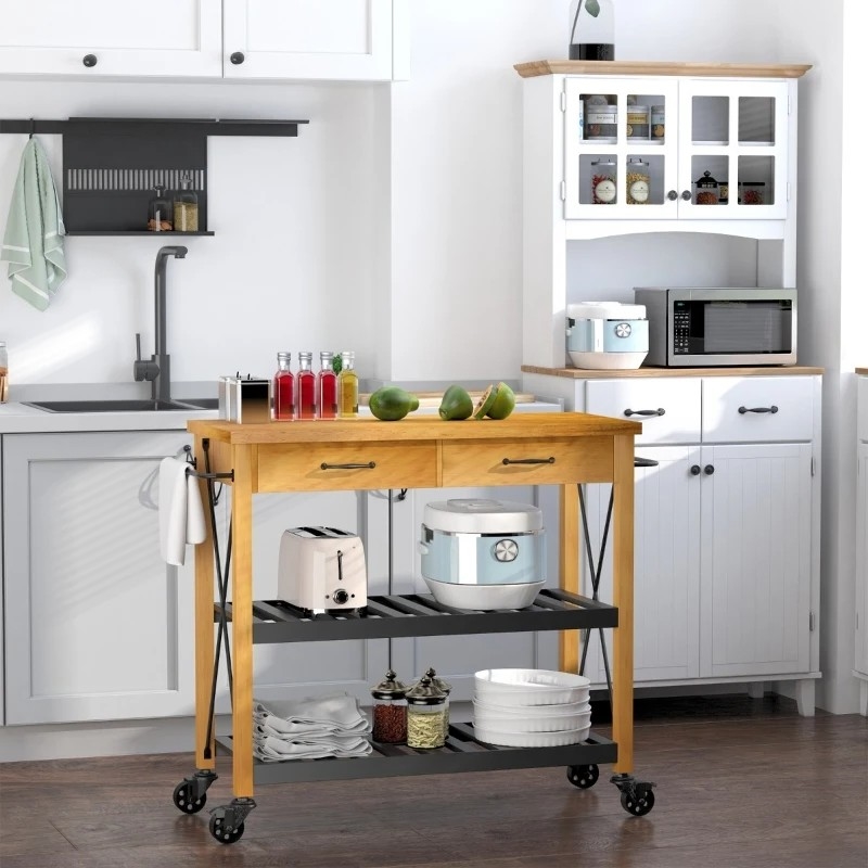 FarmHouse Rolling Kitchen Island 2 Drawers Storage with Butcher Block Rubberwood Top