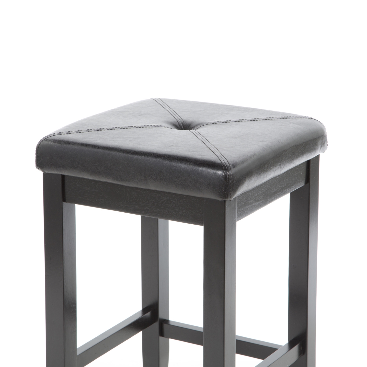 Comfort and style combined. This Set of 2 - Black 24-inch Backless Barstools with Faux Leather Seat features solid hardwood construction. The cushioned seat is upholstered in simulated leather, that is stain and spill resistant.